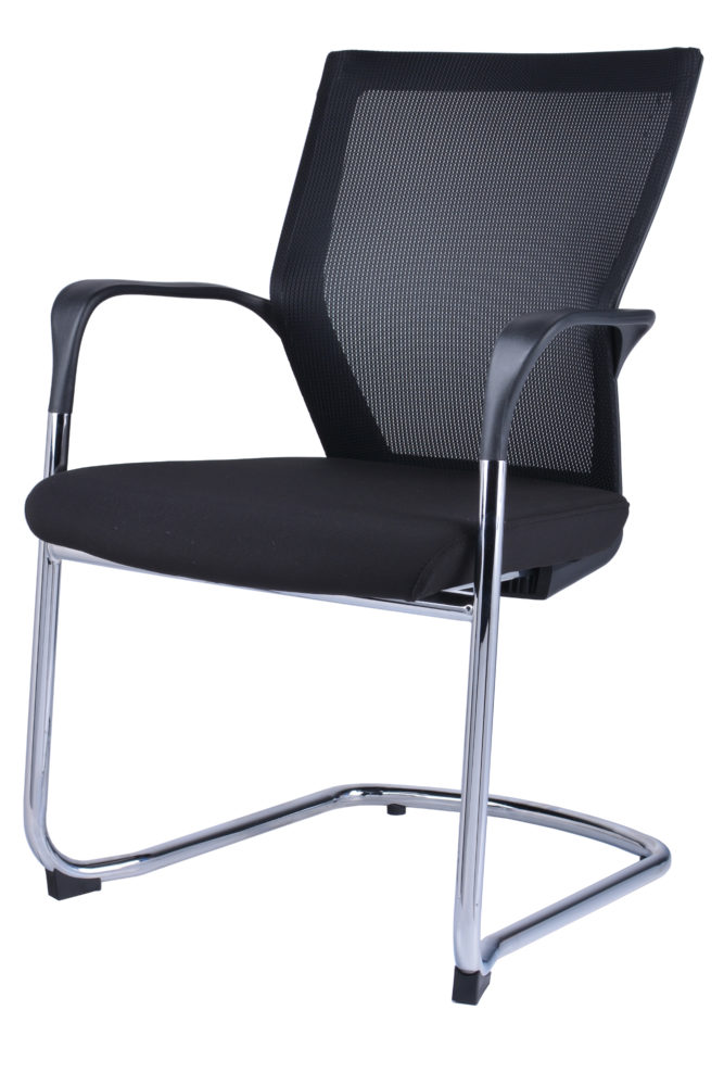 Stylish designed mesh back visitor or meeting chair. With chrome cantilever frame and arms and fabric seat. Backed by a 5 Year warranty.